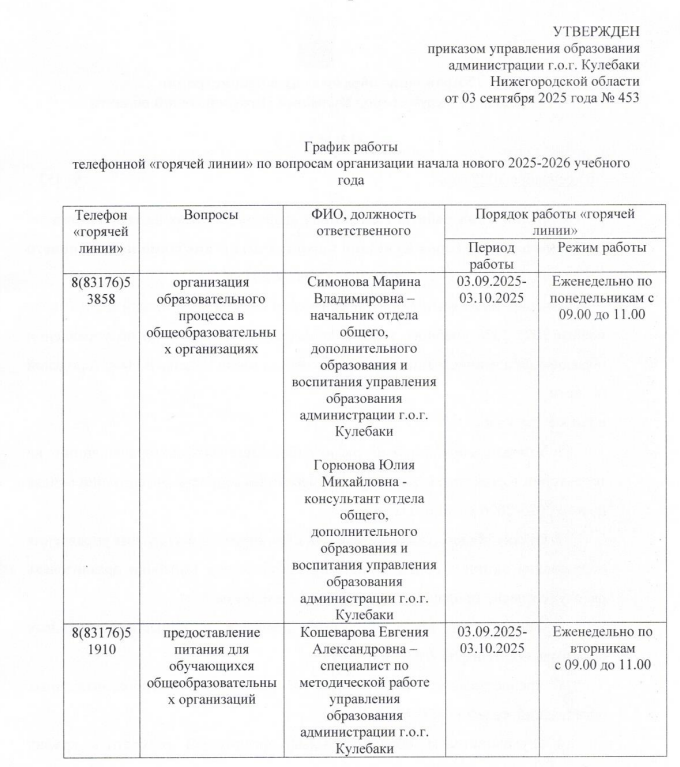 График работы телефонной «Горячей линии» по вопросам приема в первый класс в 2025 году